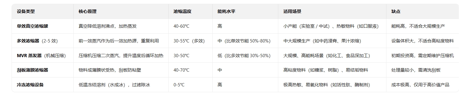 浓缩的核心是 “去除溶剂(如水)、提高固含量”,关键指标是能耗、浓缩温度、浓缩效率,常见类型对比: