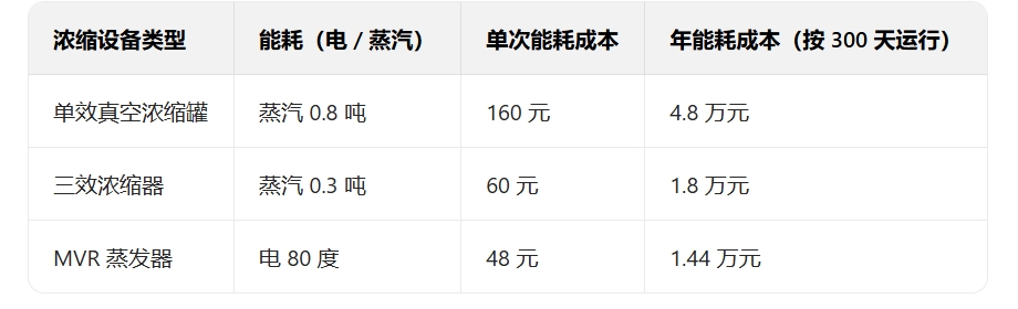 结论:MVR 蒸发器前期采购贵,但长期能耗成本最低;单效浓缩罐前期便宜,但长期能耗成本最高(适合小产能、间歇生产)。