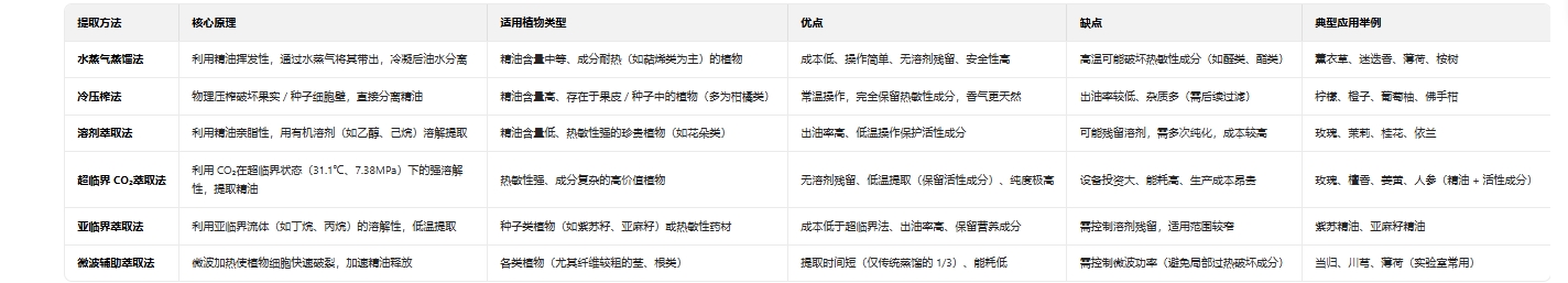 不同提取方法的适用植物、成本、精油品质差异较大,需根据植物原料特性(如精油含量、成分稳定性)和实际需求选择。以下是工业生产和实验室常用的 6 种方法: